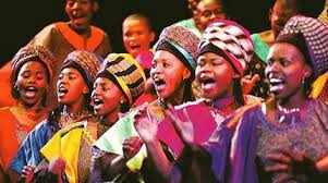 (Below; an all African gospel choir in traditional dress)